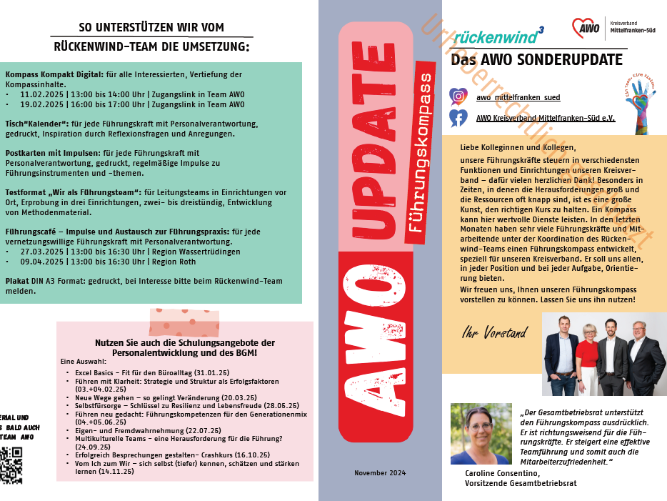 Das Projekt wird vom rückenwind³-Team gesteuert, das durch das ESF Plus Programm anteilig gefördert wird. Bei Interesse, Anregungen oder Fragen können Sie uns gerne unter rueckenwind@awo-mfrs.de kontaktieren.
